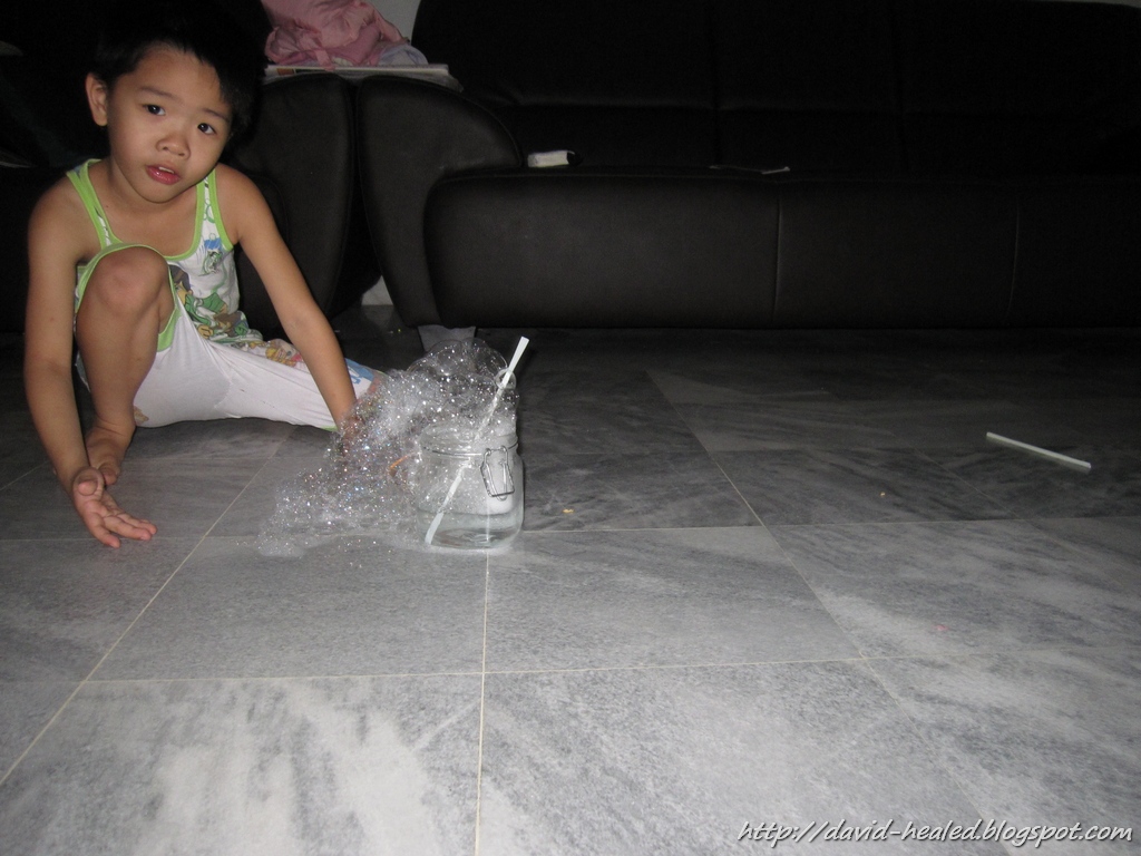 Aaron likes to play very much. He invited his friends, Yong Ken, to play homemade bubble this time. He filled a glass jar with soap water and then blew it with a straw to create a big bubble :-)